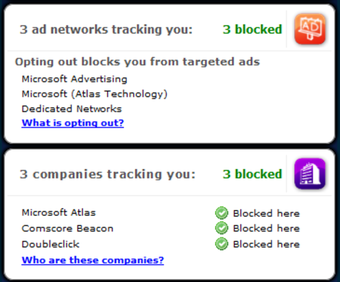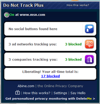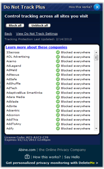 Heb je eenmaal DoNotTrackMe geïnstalleerd dan zul je verbaasd staan over hoeveel van jouw surfgedrag naar derden gaat. DoNotTrackMe blokkeert meer dan 600 trackers (servers die informatie vergaren om jou gerichte advertenties te 'bieden') en het programma blijft zichzelf updaten. In een klein knopje bovenin de balk zie je direct hoeveel trackers er zijn geblokkeerd.